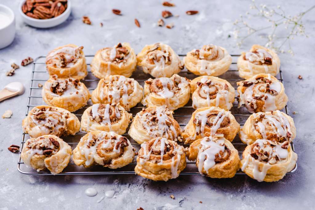 Piekarnik rozgrzać do 200 stopni. Orzechy pekan uprażyć na suchej patelni. Przestudzić i posiekać. Ciasto francuskie rozwinąć. Cukier trzcinowy wymieszać z cynamonem i solą. Ciasto posmarować roztopionym masłem i posypać mieszanką cukru i cynamonu. Zwinąć w rulon, zwijając od dłuższego boku. Rulon pokroić na plasterki i ułożyć je na blasze wyłożonej papierem do pieczenia, zostawiając […]