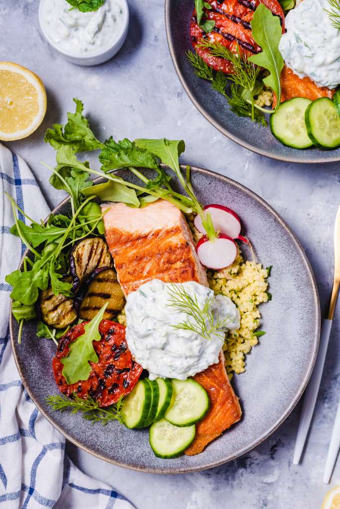 Sos tzatziki: Ogórki zetrzeć na tarce, zasypać solą (około 1/2 łyżeczki) i odstawić na 10-15 minut, aż ogórki puszczą wodę. Po tym czasie ogórki odcisnąć z wody. Dodać jogurt, posiekane zioła i przyprawy. Doprawić sokiem z cytryny i pieprzem. W razie potrzeby dosolić. Kaszę jaglaną dokładnie wypłukać i przelać wrzątkiem. Gotować pod przykryciem w jednej […]