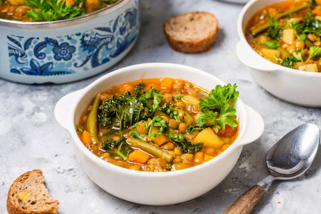 W garnku z grubym dnem rozgrzać oliwę. Do garnka wrzucić cebulę pokrojoną w kostkę i smażyć na średnim ogniu kilka minut, następnie dodać seler naciowy i marchewki pokrojone w kostkę, oraz drobno posiekany czosnek i smażyć jeszcze kilka minut. Dodać przyprawy, fasolkę szparagową, ziemniaki pokrojone w kostkę, pomidory w puszce, soczewicę, oraz bulion. Zagotować, zmniejszyć […]