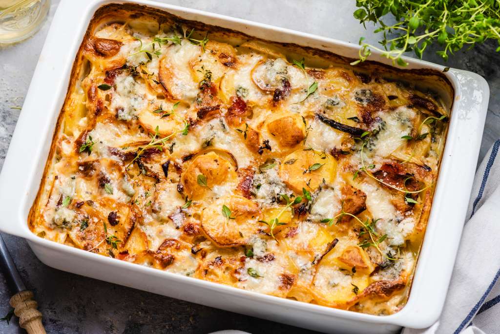 Piekarnik rozgrzać do 200 stopni. Ziemniaki obrać i pokroić w plastry. Cebule pokroić w ósemki. Boczek pokroić na mniejsze kawałki. Naczynie żaroodporne posmarować oliwą z oliwek. Wymieszać razem ziemniaki, cebulę i boczek i umieścić w naczyniu żaroodpornym. Śmietankę wymieszać z bulionem i zalać ziemniaki. Wierzch posypać listkami tymianku. Piec ok 1-1,5 godziny, do momentu aż […]