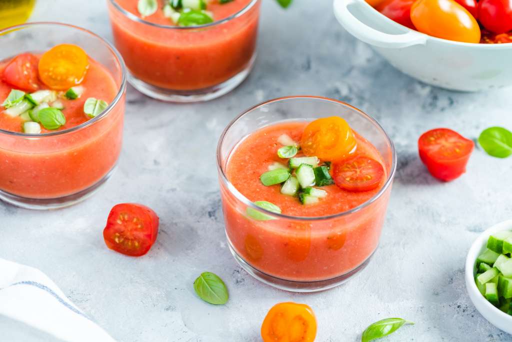 Pomidory pokroić na mniejsze części, pozbawić pestek. Ogórka obrać, przekroić na pół i za pomocą łyżeczki wydrążyć pestki. Paprykę, pozbawić gniazd nasiennych i pokroić na mniejsze kawałki. Czosnek i cebulę obrać. Do blendera przełożyć pomidory, ogórka, paprykę, cebulę i czosnek, rozdrobnić. Dodać ocet, oliwę i przyprawy, ponownie zblendować. Do blendera przełożyć chleb bez skórki, pozostawić […]