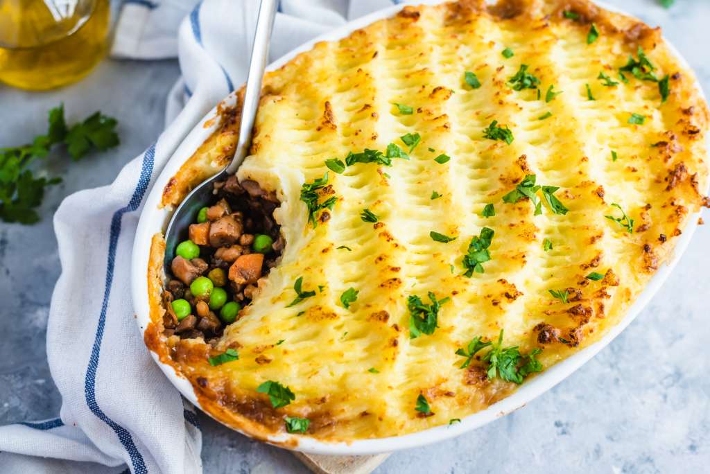 Ziemniaki obrać i ugotować z dodatkiem soli do miękkości. Odsączyć z wody, dodać masło, ugnieść, stopniowo dodawać mleko do uzyskania gładkiego puree. Cebulę, marchewki, seler naciowy, pieczarki i pomidor pokroić w drobną kostkę. Czosnek posiekać. Na dużej patelni z grubym dnem rozgrzać oliwę z oliwek. Wrzucić cebule i podsmażać na średnim ogniu przez kilka minut. […]