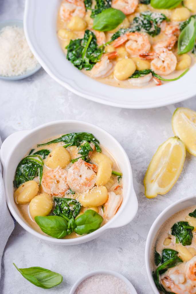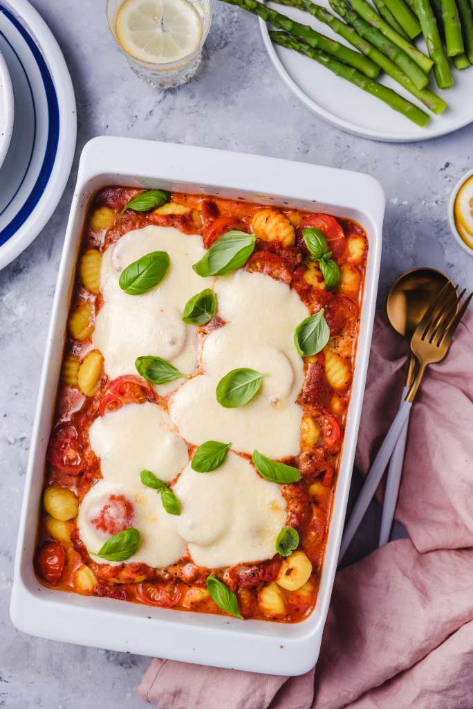 Na dużej patelni rozgrzać oliwę, dodać plasterki czosnku i smażyć około 1 minuty, dodać pomidory i przyprawy. Gotować pod przykryciem około 10 minut, aż sos stanie się gęsty i bardziej jednolity. Do naczynia żaroodpornego wlać połowę sosu pomidorowego i dodać śmietankę. wymieszać. Gnocchi przygotować wg instrukcji na opakowaniu. Gnocchi wyłożyć na sos pomidorowy, na to […]