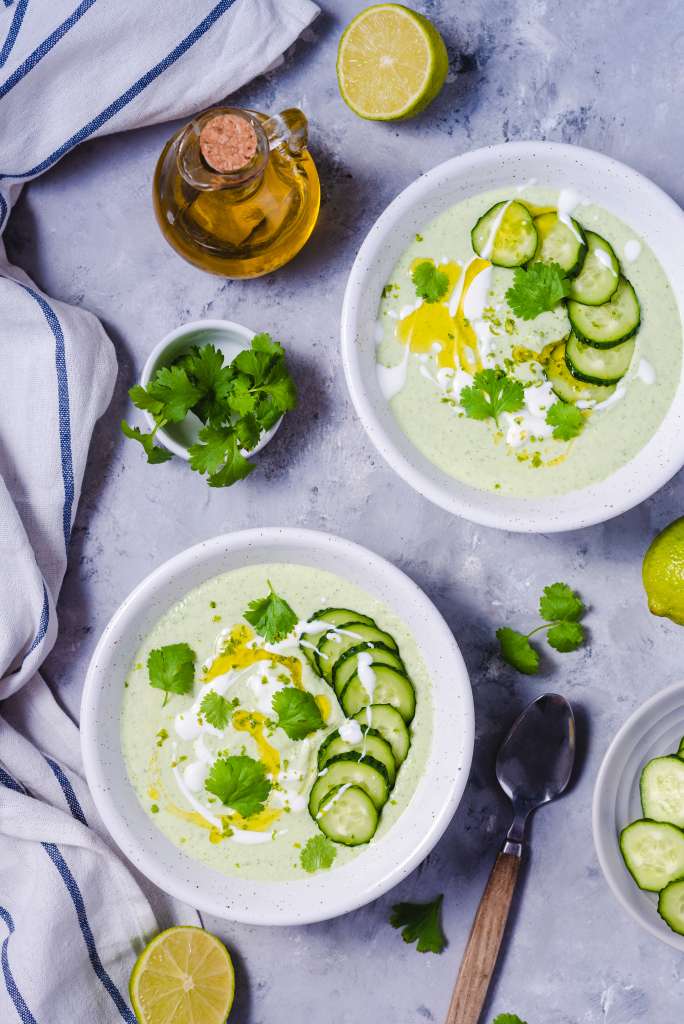 Ogórki obrać, przeciąć na pół i pozbawić pestek. Pokroić na mniejsze kawałki i przełożyć do blendera. Dodać awokado, czosnek, szalotki, skórkę z limonki, świeżą kolendrę. Zacząć rozdrabniać. Kiedy składniki będą już rozdrobnione, dodać jogurt, sok z limonki, ocet jabłkowy i oliwę. Rozdrobnić na gładki krem. Przyprawić do smaku solą i pieprzem. Chłodnik schłodzić w lodówce […]