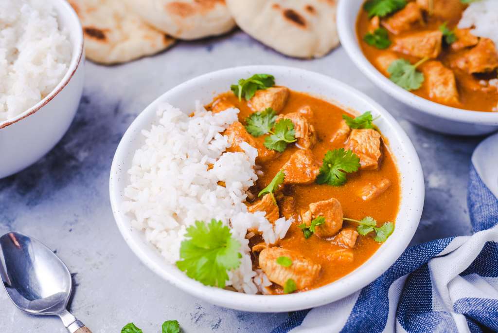 Wszystkie przyprawy wymieszać. Oliwę z oliwek rozgrzać na dużej patelni. Na rozgrzaną patelnię wrzucić cebulę pokrojoną w kostkę. Smażyć na średnim ogniu około 5 minut. Następnie dodać drobno posiekany czosnek i imbir. Smażyć około 30 sekund i dodać mieszankę przypraw. Smażyć kolejne 30 sekund. Dodać bulion z kurczaka i pomidory w puszce. Zagotować, zmniejszyć ogień […]
