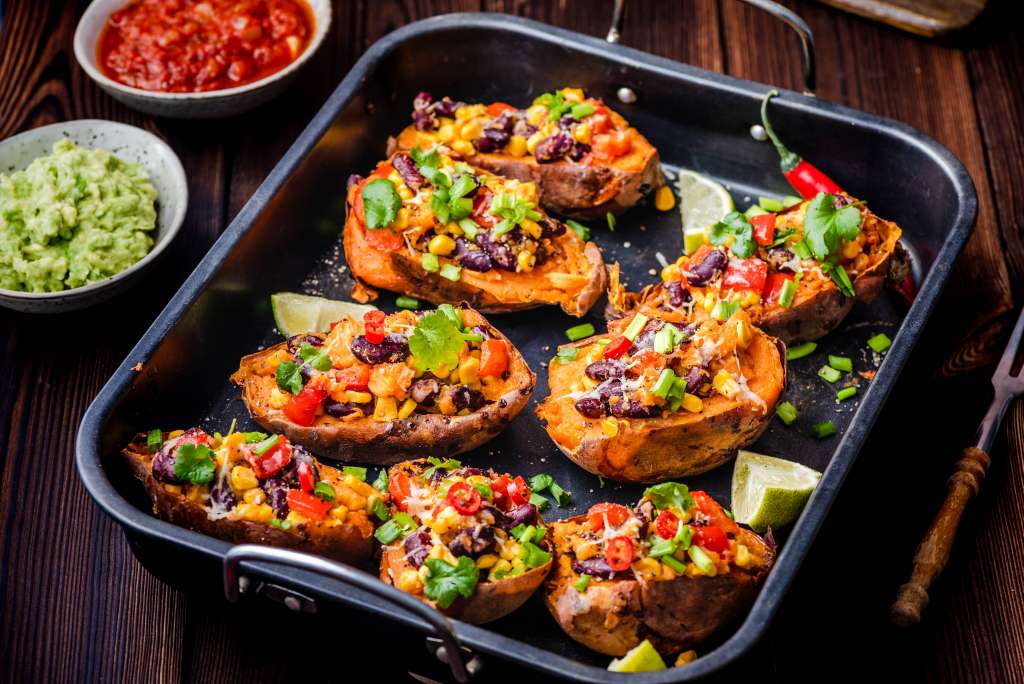 Bataty umyć i nakłuć kilka razy widelcem. Wyłożyć na blachę i piec w temperaturze 220 stopni przez ok. 50 minut. Na patelni rozgrzać oliwę, wrzucić pokrojoną w kostkę cebulę i smażyć na średnim ogniu ok. 3 minut, dodać pokrojoną w kostkę paprykę i dalej smażyć do momentu aż papryka zmięknie. Przyprawić solą i pieprzem. Odstawić. […]