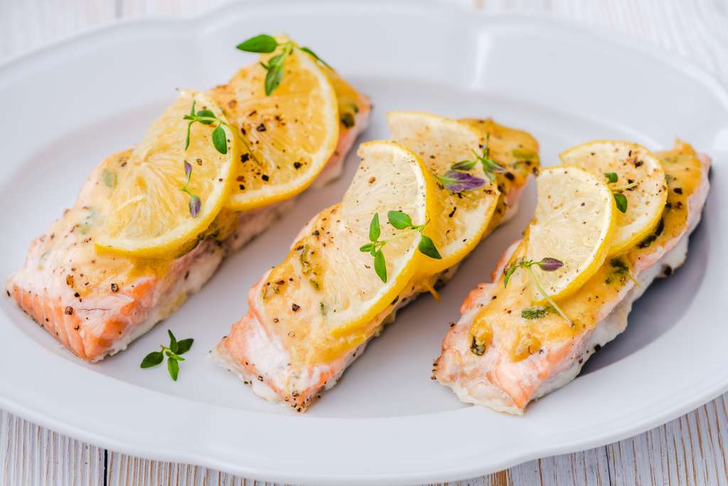 Łososia umyć, osuszyć i pokroić na mniejsze filety. Wyłożyć na blachę wyłożoną papierem do pieczenia. W miseczce wymieszać razem musztardę, oliwę, czosnek, sok c cytryny, posiekany tymianek, sól i pieprz. Powstałym sosem posmarować filety, a następnie przykryć plasterkami cytryny. Piec w temperaturze 180 stopni około 8-12 minut, w zależności od preferencji. […]