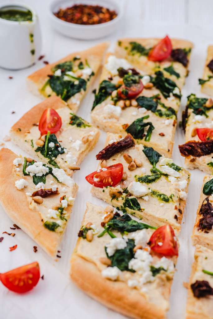 Ciasto uformować na blasze wyłożonej papierem do pieczenia. Za pomocą widelca zrobić dziurki na całości ciasta oprócz brzegów. Piec w temperaturze 220 stopni przez 8-10 minut. Upieczone ciasto ostudzić. Na patelni rozgrzać odrobinę oliwy z oliwek. Podsmażyć czosnek pokrojony w plasterki. Dodać szpinak, przyprawić solą i pieprzem i smażyć dopóki szpinak nie zwiędnie i nie […]