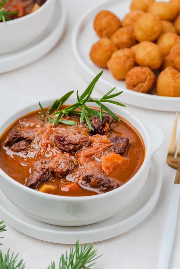 Oliwę rozgrzać na dużej patelni. Wrzucić pokrojoną w kostkę cebulę i zeszklić. Wołowinę pokroić w grubą kostkę, dodać do cebuli i smażyć do momentu, aż z każdej strony zrobi się brązowa. Wlać wino, wymieszać, przykryć i dusić przez ok. 15 minut. Po tym czasie dorzucić pokrojone w kostkę pomidory oraz przecier pomidorowy. Przyprawić rozmarynem i […]