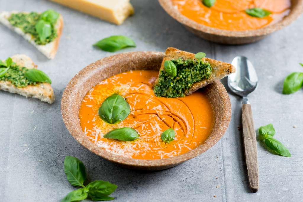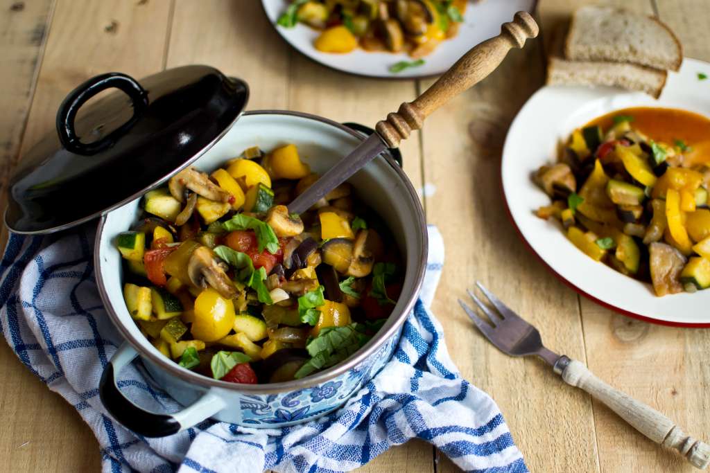 Bakłażana, cukinię i paprykę pokroić w kostkę. Pieczarki przekroić na 4, czosnek pokroić w plasterki, a cebulę drobno posiekać. W garnku z grubym dnem rozgrzać oliwę. Podsmażyć na niej bakłażana oraz cebulę, przyprawić solą i pieprzem, po chwili dodać czosnek i podsmażać jeszcze około minuty. Odłożyć do miski. W tym samym garnku podsmażyć pieczarki z […]
