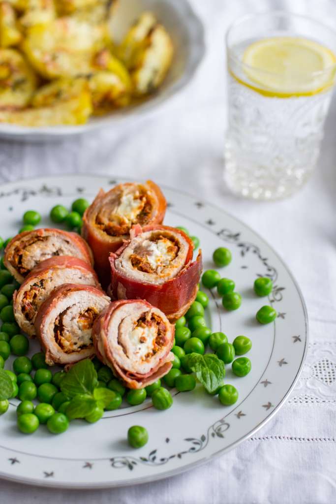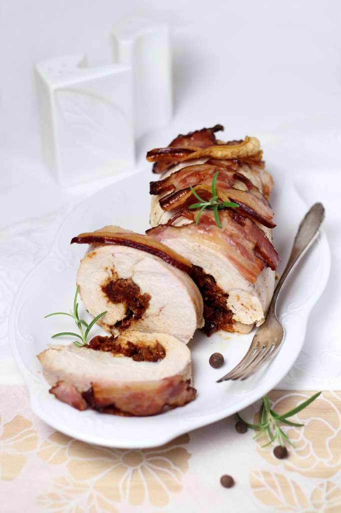 Pierś indyczą naciąć wzdłuż trzykrotnie tak, aby powstał płat mięsa równej grubości. Ułożyć między dwa arkusze folii przezroczystej i lekko rozbić tłuczkiem i lekko osolić. Osączone z zalewy suszone pomidory oraz czosnek z chili posiekać i wymieszać z tartym serem Parmigiano Reggiano, oliwą i rozmarynem. Doprawić solą i pieprzem. Przygotowaną pastę rozsmarować na płacie mięsa […]
