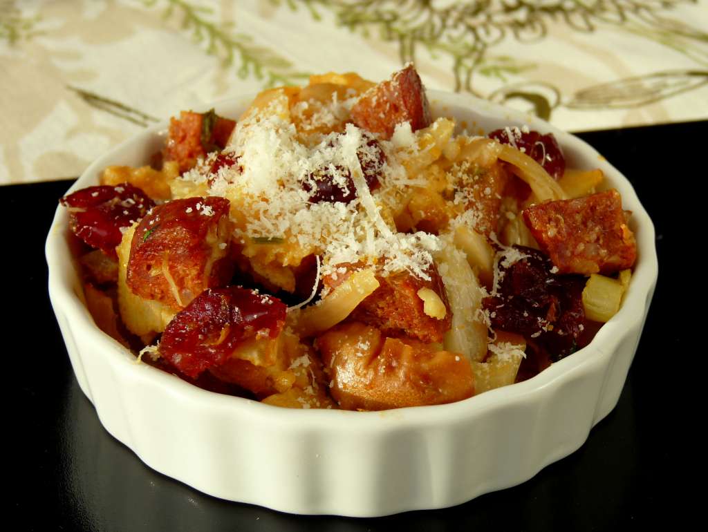 Piekarnik nagrzać do 180 stopni Celsjusza. Zdjąć osłonkę z chorizo i pokroić w kostkę. Jabłko umyć, obrać i pokroić w kostkę. Cebulę, czosnek obrać i drobno posiekać. Seler naciowy umyć, pokroić w cienkie plasterki. Fenkuł umyć, przekroić na pół, wykroić głąb, którzy wyrzucamy. Pozostałą część pokroić w cienkie plastry. Natkę pietruszki umyć i drobno posiekać. […]