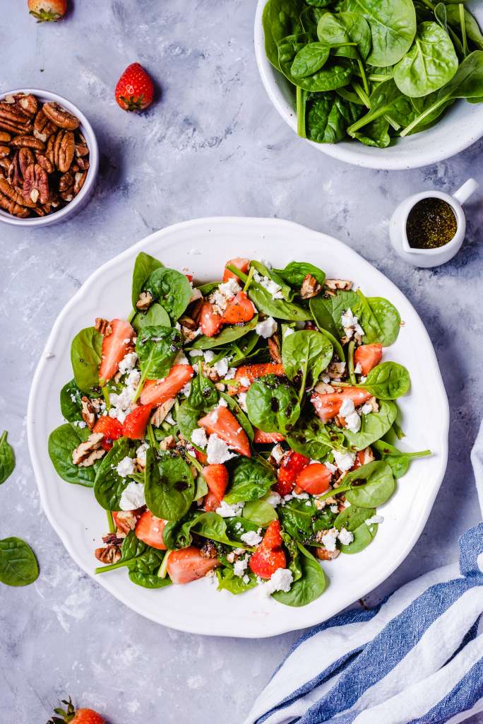 Truskawki obrać z szypułek i pokroić na 4 części. Orzechy pekan uprażyć na suchej patelni i posiekać. Czosnek obrać i przecisnąć przez praskę. Wszystkie składniki dressingu dokładnie razem wymieszać. Na dużym półmisku ułożyć szpinak, kawałki truskawek, posypać orzechami pekan i rozkruszyć ser feta. Polać dressingiem. […]