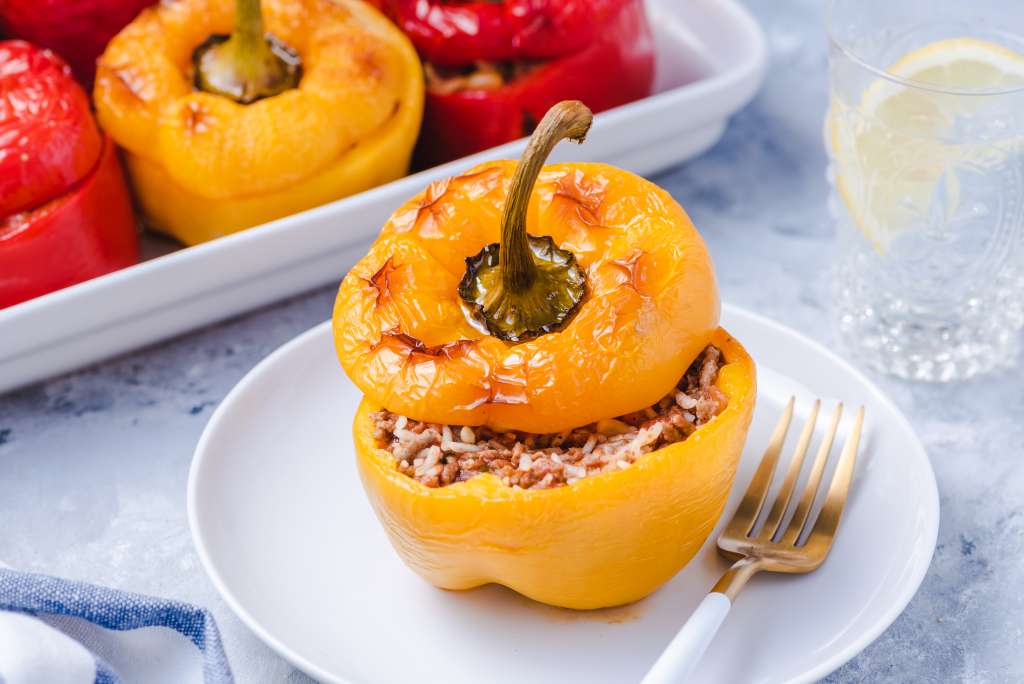 Odciąć górną część z papryk na pokrywki. Usunąć gniazda nasienne. Na dużej patelni rozgrzać oliwę z oliwek. Usmażyć na niej drobno posiekaną cebulę. Następnie dodać mięso rozdrobnić widelcem i od razu dodać czosnek, zioła prowansalskie, pomidory, passatę oraz koncentrat. Wszystko dokładnie wymieszać i podgrzać. Przyprawić obficie solą i pieprzem. Zdjąć z patelni i zostawić na […]
