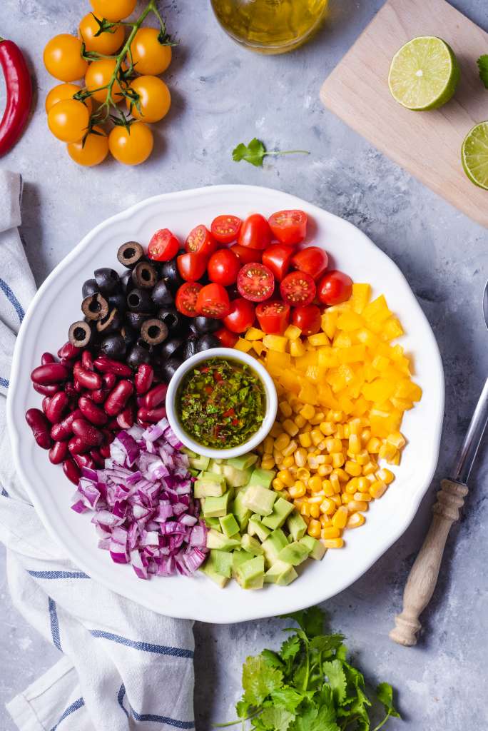 Kukurydzę i fasolę odsączyć z zalewy i dokładnie wypłukać. Pomidorki i oliwki przekroić na pół. Paprykę, awokado i czerwoną cebulę pokroić w drobną kostkę. Przygotować dressing. Czosnek obrać pokroić na plasterki, posypać solą i rozetrzeć nożem na pastę. W miseczce wymieszać razem oliwę, sok z limonki, miód, roztarty czosnek, drobno posiekaną papryczkę chilli i kolendrę. […]