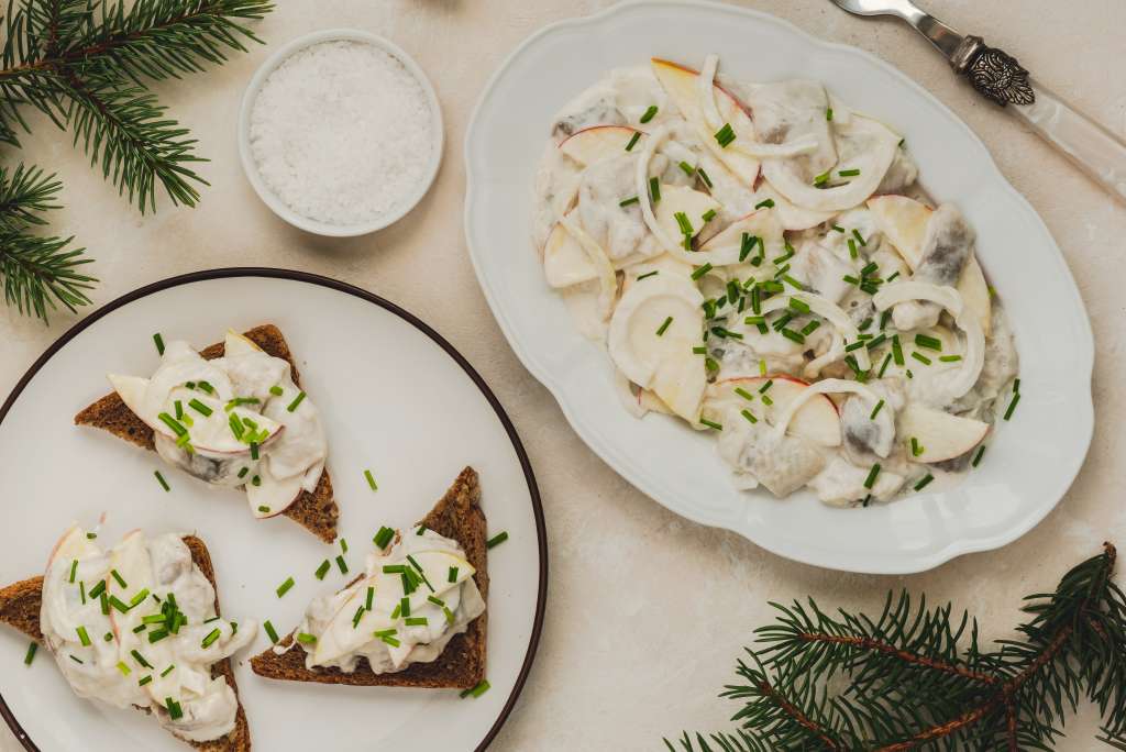 Filety śledziowe pokroić na około 3 cm kawałki. Cebulę obrać, pokroić w piórka. Jabłko pokroić w cienkie plasterki, skropić sokiem z cytryny. Śmietanę wymieszać z majonezem, przyprawić. Powstały sos wymieszać ze śledziami, cebulą i jabłkiem. Posypać szczypiorkiem, lub koperkiem. […]