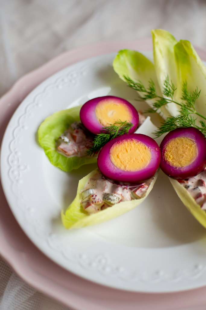 Jajka ugotować na twardo. Ostudzić i obrać ze skorupek. W dużym słoiku wymieszać dokładnie składniki marynaty i włożyć do niej jajka. Słoik zakręcić i włożyć do lodówki na 12 -godzin do 3 dni. Im dłużej jajka będą w marynacie, tym intensywniejszy kolor jajek otrzymamy. Po tym czasie wyjąć jajka z marynaty, umyć i przekroić na […]