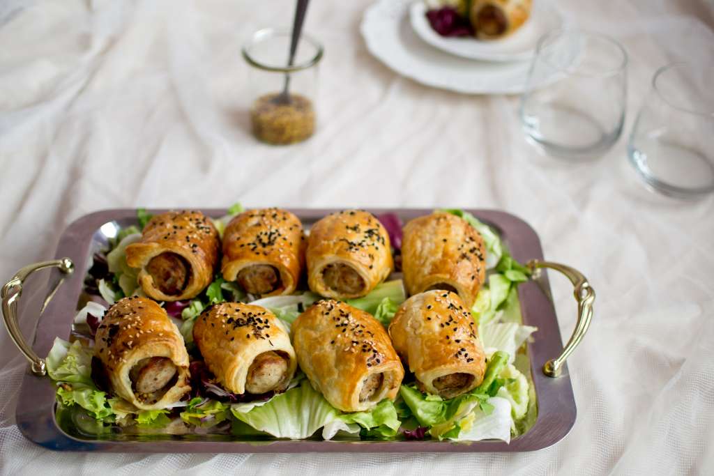 Ciasto francuskie rozwinąć i pokroić na 10 równych prostokątów. Każdy prostokąt posmarować musztardą francuską. Białe kiełbasy przekroić w poprzek na pół. Połówki kiełbasek zawinąć w kawałki ciasta, zlepiając brzegi. Ułożyć na blasze wyłożonej papierem do pieczenia. Posmarować jajkiem rozmieszanym z odrobiną wody. Posypać sezamem, czarnuszką i kminkiem. Piec około 30 minut w temperaturze 200 stopni. […]