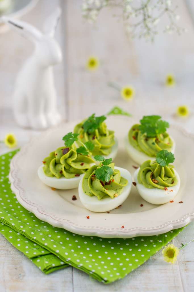 Jajka przekroić na połówki. Pozbawić je żółtek i odłożyć na bok. Żółtka przełożyć do blendera, dodać pozostałe składniki, przyprawić i zmiksować na jednolitą masę. Spróbować i w razie potrzeby doprawić. Gotową masę przełożyć do rękawa cukierniczego i wyciskać do połówek jajek. Udekorować listkami kolendry i płatkami chilli. Od razu podawać. […]